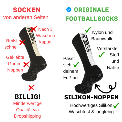 Unsere Footballsocks gehören zu den hochwertigsten Produkten auf dem Markt, basierend auf unserer langjährigen Erfahrung. Wir wissen, dass es viele günstige Anbieter mit minderwertiger Qualität gibt. Tatsächlich erhalten wir sogar Rücksendeanfragen von Kunden, die bei solchen Fake-Shops eingekauft haben. Bei uns kannst du sicher sein, dass du qualitativ hochwertige Socken erhältst, die den Anforderungen des Sports gerecht werden und dir langfristig Freude bereiten.