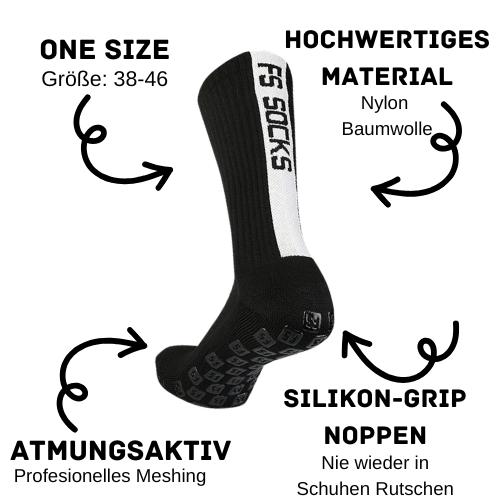 Unsere Footballsocks sogenannte Fußballsocken mit Silikon-Noppen sind die perfekte Wahl für alle Fußballspieler, die nach optimalem Halt und Komfort auf dem Spielfeld suchen. Diese Socken sind speziell entwickelt worden, um deine Leistung zu verbessern und gleichzeitig Verletzungen vorzubeugen. Die Socken bestehen aus hochwertigen Materialien, die eine optimale Atmungsaktivität und Feuchtigkeitsregulierung bieten. Egal, ob du auf dem Rasen oder in der Halle spielst, deine Füße bleiben trocken und frisch, während du dich voll und ganz auf das Spiel konzentrieren kannst. Ein herausragendes Merkmal dieser Socken sind die Silikon-Noppen an der Unterseite. Diese Noppen sorgen für einen hervorragenden Halt und Grip auf dem Boden. Du wirst eine verbesserte Traktion spüren, egal ob du scharfe Drehungen, schnelle Sprints oder präzise Schüsse machst. Die Noppen bieten auch Schutz vor rutschigen Oberflächen und helfen, das Risiko von Verletzungen durch Ausrutschen zu verringern.